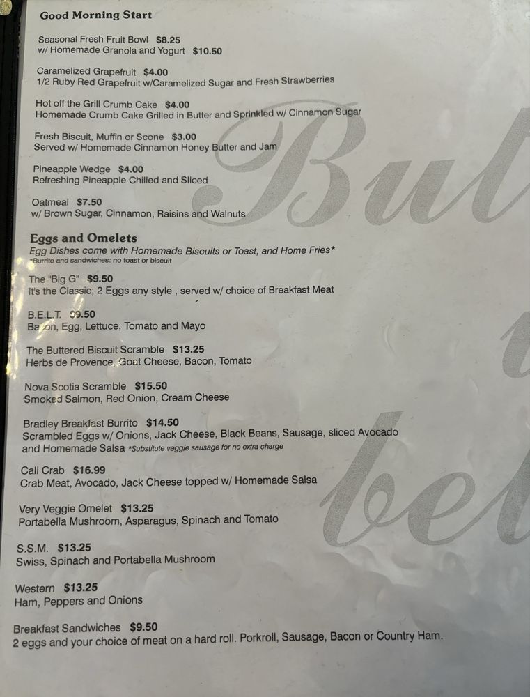 “ You're not supposed to judge a book by its cover, and you're not supposed to pick a restaurant because of its name. Oh well. The Millennial Chum and I stopped here for brunch after a weird/uneven town-wide yard sale in nearby Ocean Grove (which had like 10 yard sales despite the fact that that town was tailormade for such an event; maybe they'll figure it out next year). I can always get down for a buttered biscuit, and both of us were in a plant challenge that required us to eat 30 different plants in a week so the app section promoting the grapefruit and pineapple helped seal the deal for us. The location is super convenient though it was definitely busy midday on a sunny, hot Saturday. We secured parking about 100 yards away (we initially parked near the train station but weren't convinced that we wouldn't be towed during the meal despite it being the weekend) and were pleased to find zero wait for either indoor or outdoor seating. Since some of the outdoor tables had shade, that's where we went, right on the sidewalk for some primo canine chum viewing. We split the aforementioned appetizers, the grapefruit and pineapple. Great optics, especially for the pineapple, and there's something about cold fruit during a heat wave that hits differently. That said, both of us felt the grapefruit was an unfortunate miss; the caramelized sugar is burned, basically like a Creme Brulé situation, and the tang of the burn doesn't mesh well with the acidity of the grapefruit, in my opinion - it basically doubles down on a really intense flavor. I'd suggest they maintain the sugar to balance it out (it's the right idea), but leave the mini blowtorch at home. The pineapple was better; little on the tougher side but I'm not sure there's a way to avoid that when the pineapple is made-to-order like this. The inclusion of the strawberries on both was clutch though. In the least surprising development of the day, the biscuits were the star. I got the Eggs Oscar (Eggs Benedict with crabcake and asparagus), which was decent. I wouldn't have gotten the asparagus if we weren't in the plant challenge, especially if I'd known they were chopped into the dish like this, but they weren't bad, just crunchier than I prefer (and that's on me). The almighty biscuit was perfect, and the hollandaise wasn't utilized too heavily, which to me is always the downfall of that dish. Surprisingly, the crabcake was kind of a non-entity here - I could barely taste it so I'm not sure if it wasn't a big portion comparatively speaking or if it just got drowned out by the other flavors. But by far my favorite part was when the Millennial Chum last minute ordered a single biscuit to split, which we applied with cinnamon butter. Heavenly. The service was very good. Our waitress was clearly busy (understandably so) but stopped by regularly and was friendly/engaging, good-naturedly teasing us from time to time. The food came out pretty much immediately, and I don't recall a wait time for really anything; a well-oiled machine in most respects. Also, we were both visibly stunned at the bill - $4 apps? In a Jersey Shore town during summer? Truly wild. Lot of solid intangibles here, and at the very least I've found a biscuit that rivals Roy Rogers (RIP) for the best all time. ”